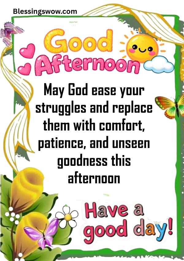 - May God ease your struggles and replace them with comfort, patience, and unseen goodness this afternoon. Have a joyful day.